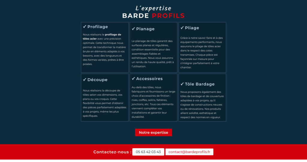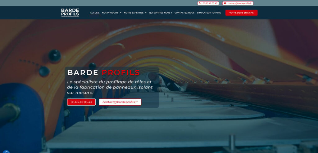 Ce projet consistait en la conception et le développement d’un site internet entièrement sur mesure pour l’entreprise Barde Profils, spécialisée dans la fabrication de solutions de bardage et de toiture en aluminium (bac acier), basée à Graulhet dans le Tarn.